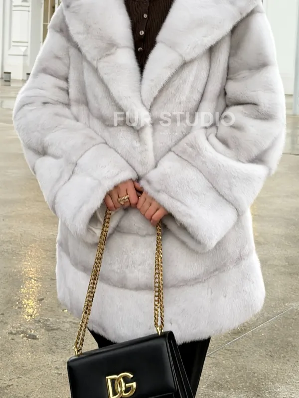 Мех данной шубы аукционная норка, цвет белый. Предлагается в размерах от 42 до 52. Длина модели 75-80 см, что выгодно подчеркивает фигуру девушек. Эта модель идеально подойдет для девушек и женщин, предпочитающих роскошные натуральные меха.