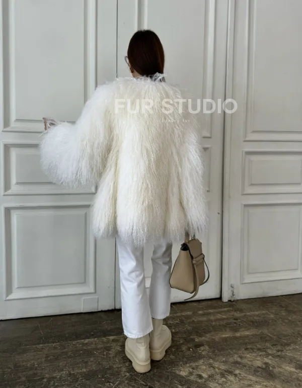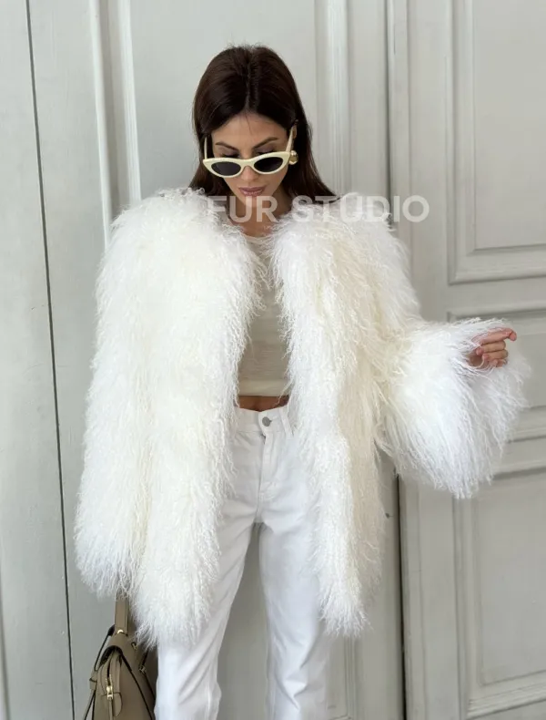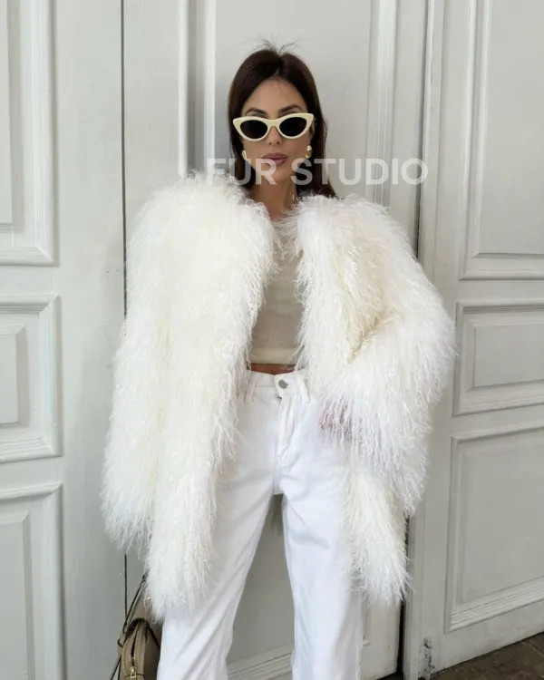 Белая шуба из меха ламы 100881