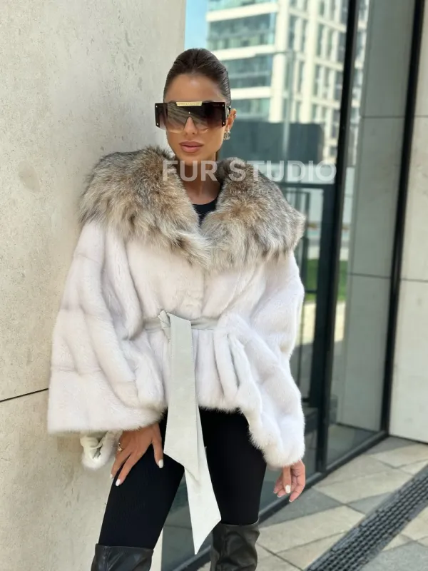 Белое норковое манто с капюшоном из меха рыси – выбор девушек, которые готовы экспериментировать. Летучка сделает ваш образ легким и воздушным. Необычный цвет напомнит о лете и освежит ваш стиль. Нежный мех бережно согреет владелицу в любые холода. Шикарный капюшон из рыси позаботится, чтобы волосы были в тепле.
