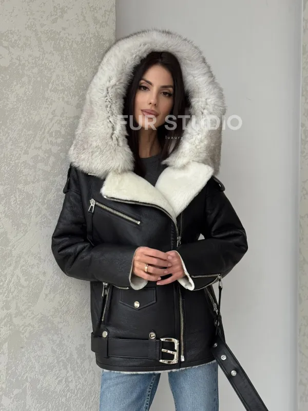 Черная куртка дубленка с капюшоном 100256