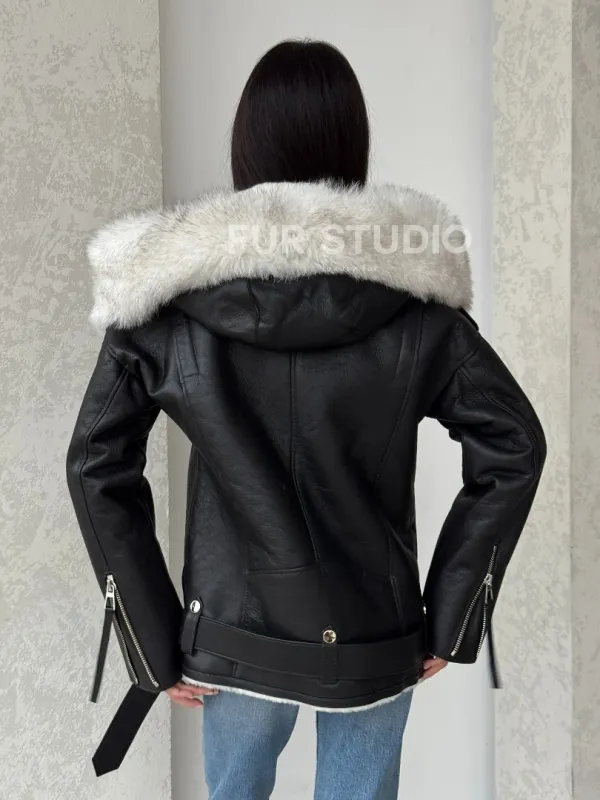 Черная куртка дубленка с капюшоном. Модель предлагается в размерах от 42 до 54. Оптимальная длина моделей 60-65 см подчеркивает линии вашей фигуры. Эта дубленка станет неотъемлемой частью гардероба для тех, кто предпочитает роскошь и утонченность натуральной кожи.