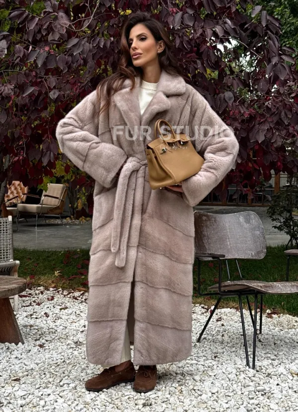 Длинная норковая шуба с поясом 102344