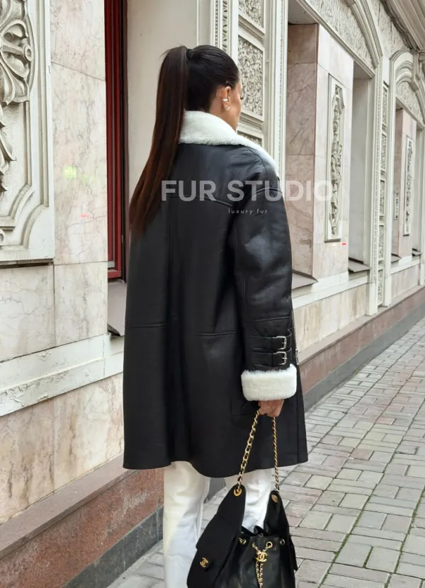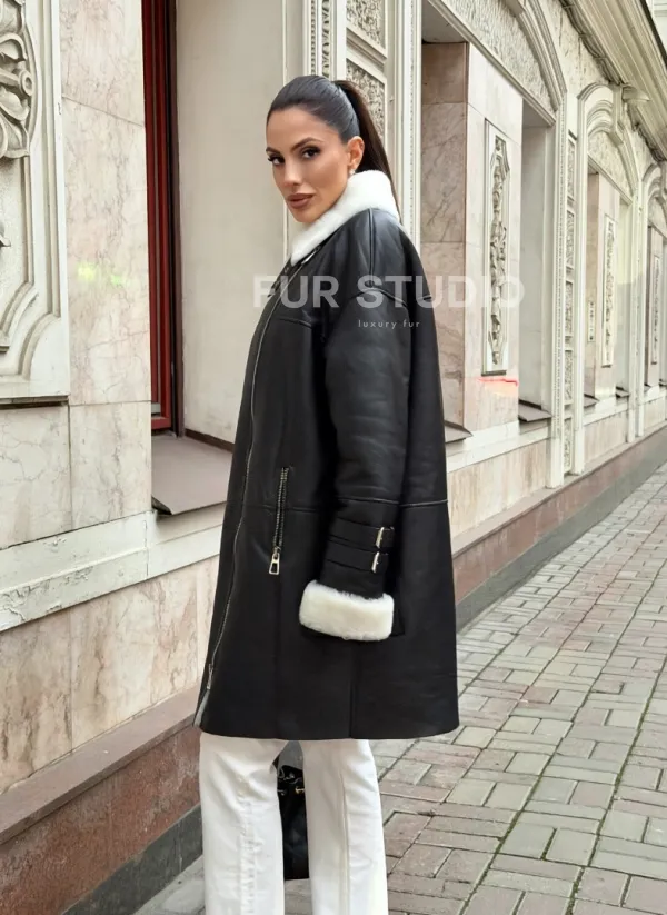 Дубленка авиатор длинная на белой овчине 102703