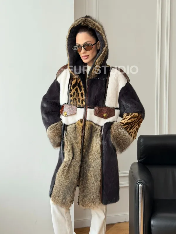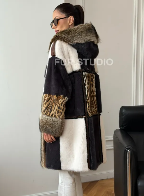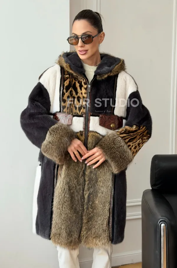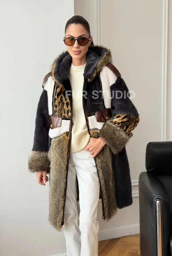 Комбинированная норковая шуба с капюшоном доступна для покупки в нашем шоуруме Furs Studio в . У нас так же есть доставка во все города России. Добавьте немного роскоши в свой гардероб с этой шубой, которая будет служить вам многие годы.