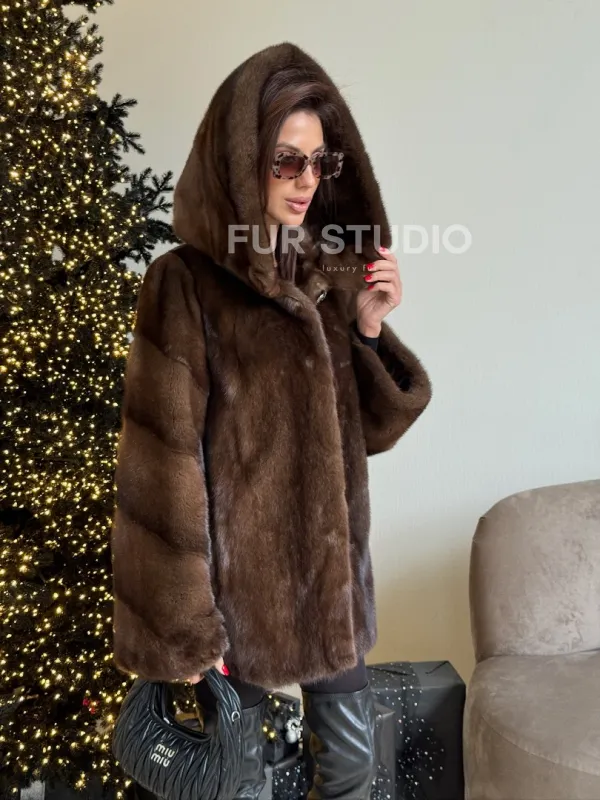 Норковый жакет с капюшоном, роспуск в цвете орех доступна для покупки в нашем шоуруме Furs Studio в . У нас так же есть доставка во все города России. Добавьте немного роскоши в свой гардероб с этой шубой, которая будет служить вам многие годы.