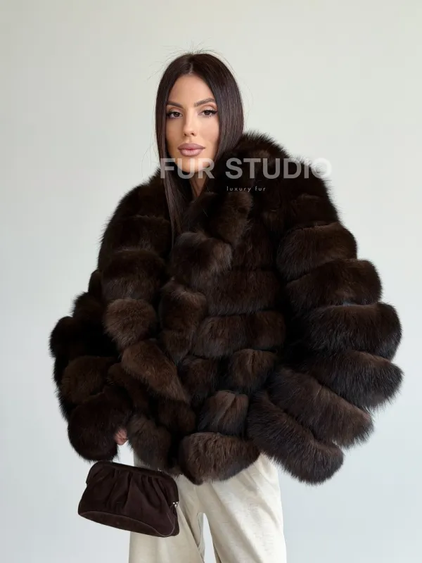 Мех данной шубы финский песец, цвет коричневый. Предлагается в размерах от 42 до 50. Длина модели 60-65 см, что выгодно подчеркивает фигуру девушек. Эта модель идеально подойдет для девушек и женщин, предпочитающих роскошные натуральные меха.