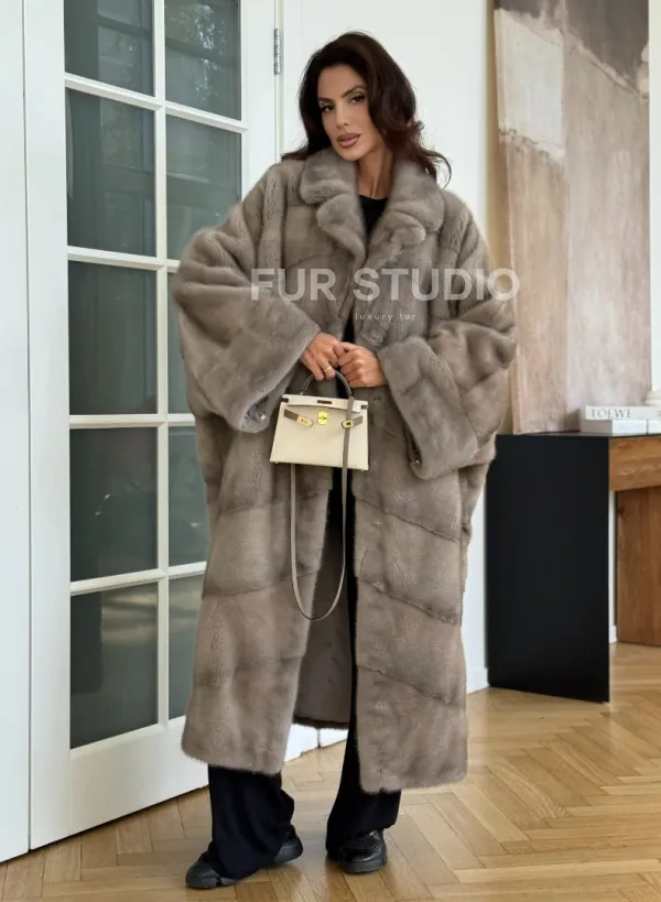 Мех данной шубы аукционная норка, цвет серый. Предлагается в размерах от oversize (42 до 66). Длина модели 120-125 см, что выгодно подчеркивает фигуру девушек. Эта модель идеально подойдет для девушек и женщин, предпочитающих роскошные натуральные меха.