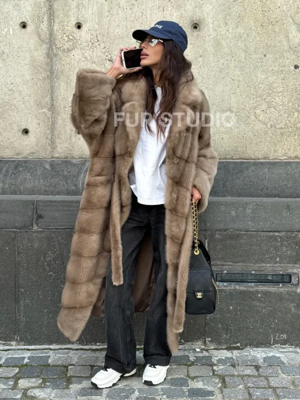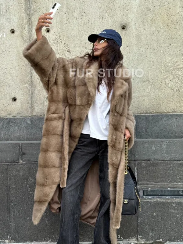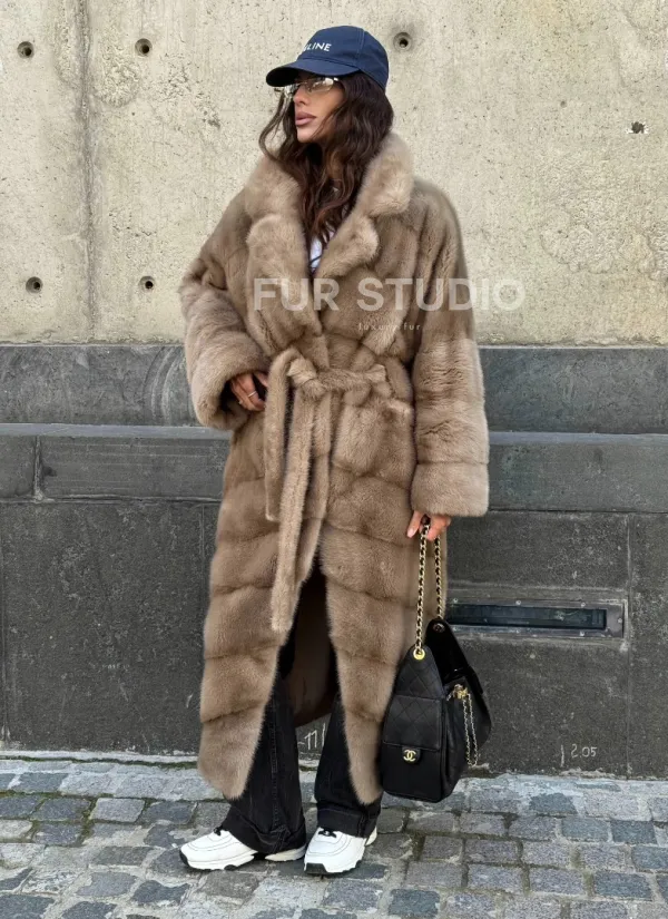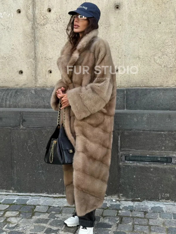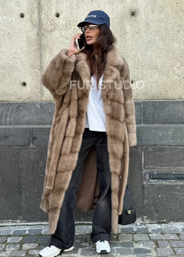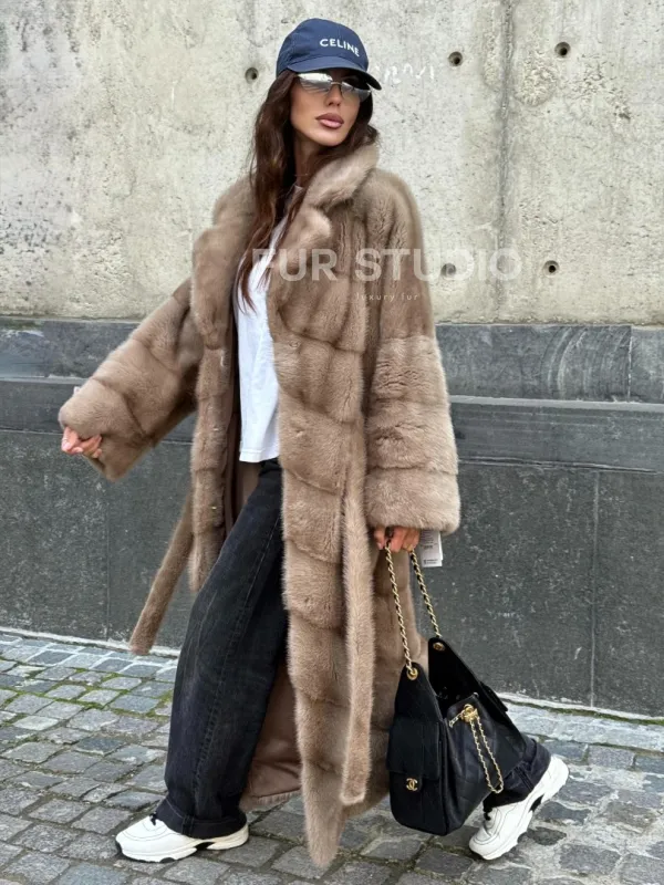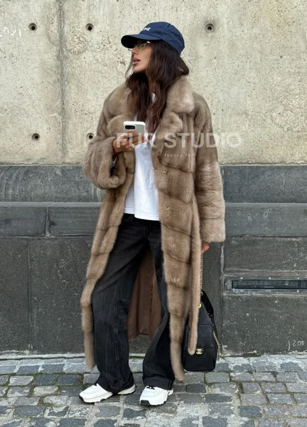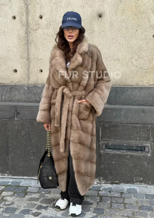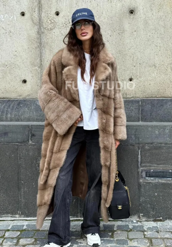 Мех данной шубы аукционная норка, цвет бежевый. Предлагается в размерах от 42 до 50. Длина модели 115-120 см, что выгодно подчеркивает фигуру девушек. Эта модель идеально подойдет для девушек и женщин, предпочитающих роскошные натуральные меха.
