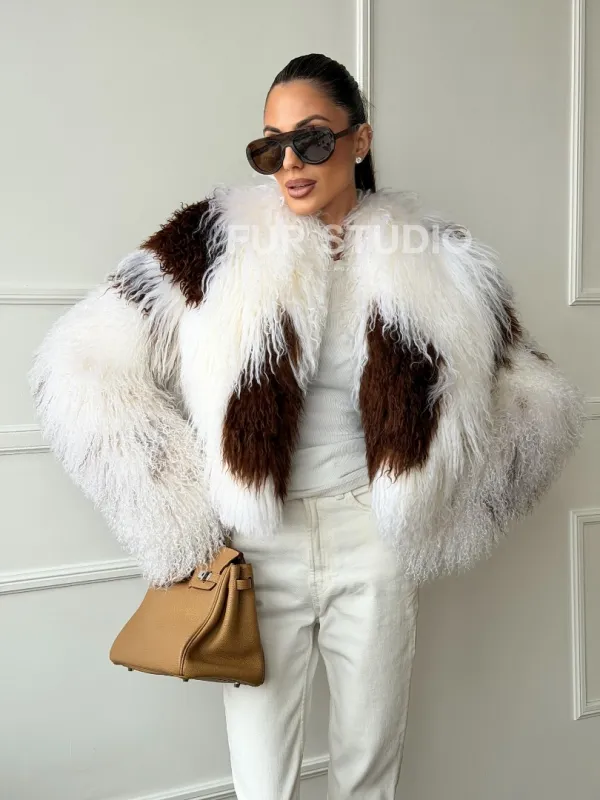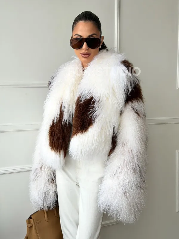 Шубка из ламы бело-коричневая 102654